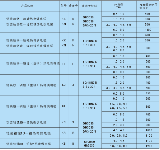 鎧裝偶材(鎧裝絲),******上稱為MI電纜,是制造鎧裝熱電偶的材料。分度號(hào)有K、E、N、T、J、S、R、B,外直徑從0.5-10.8,外套管材料有:321,SUS310(2520),SUS316,304,GH3030,INCONEL-600,***高使用溫度1300℃。