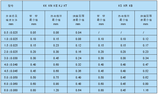 注:對(duì)于多芯或單芯鎧裝熱電偶電纜的管壁、熱電偶絲直徑和絕緣層厚度允許作少許調(diào)整.